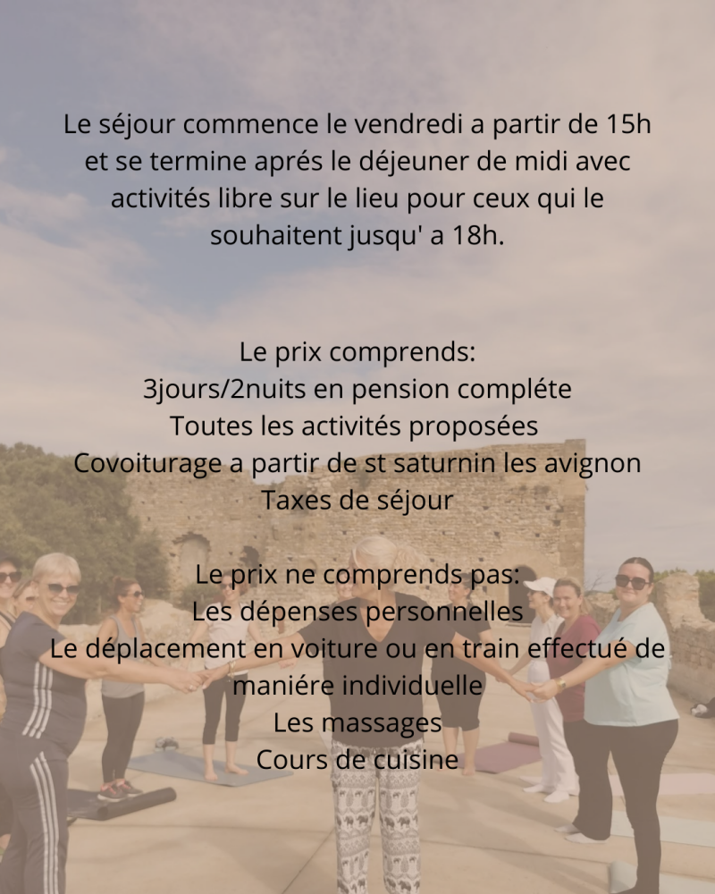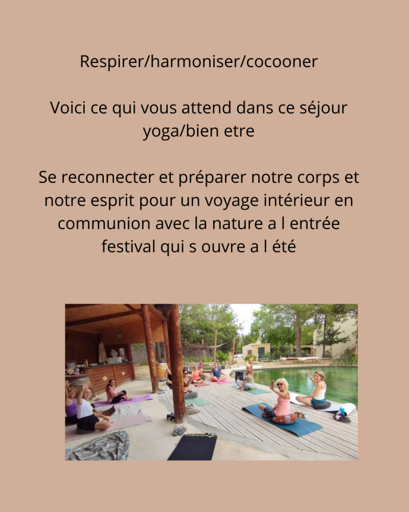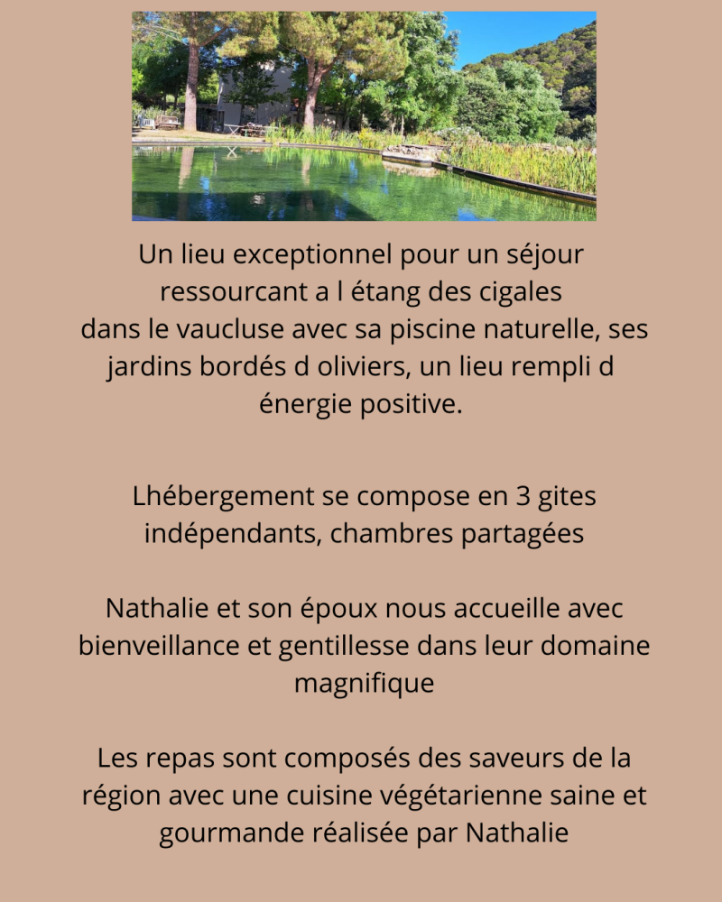 Besoin de se recentrer ? Prenez une pause bien-être avec Divine Yoga. Venez célébrer l'arrivée de l'été dans un domaine en pleine nature, au calme, bercé par le doux chant des cigales. Profitez d'un week-end yoga et bien-être dans un cadre naturel magnifique, avec sa piscine naturelle bordée d'oliviers. Une cuisine végétarienne délicieuse, issue de produits locaux frais et circuits courts, préparée avec amour par Nathalie, complétera votre expérience. Nous sommes ravis de vous accueillir pour une aventure de ressourcement inoubliable.